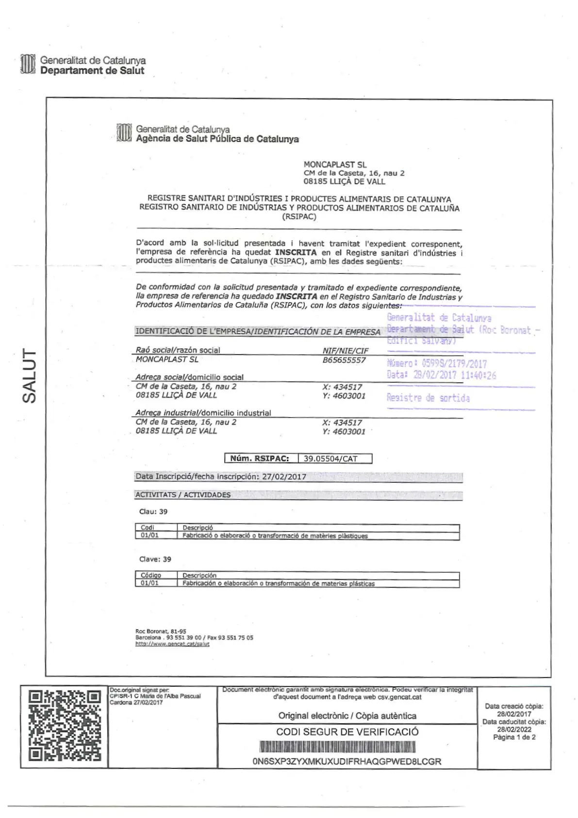 Moncaplast, tiene implantado un sistema procedimental para poder controlar sus procesos dentro de unos estrictos parámetros de calidad. Basados en control en línea y en un proceso de control en continuo, que nos permite asegurarnos de la calidad y repetibilidad de los productos fabricados, así como un control de proveedores y materias primeras. Que basado en un procedimiento de trazabilidad y control, nos permite, no solo controlar fabricaciones repetitivas y dentro de los parámetros definidos en su proceso sino asegurarnos de no hacer variaciones dentro del diseño del producto.